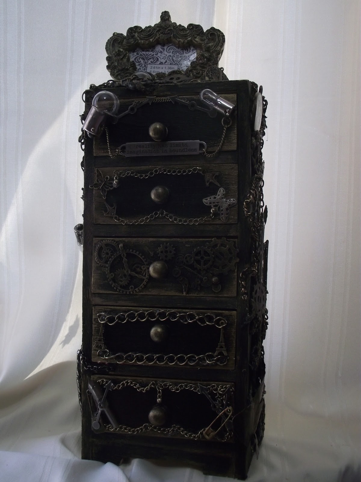 My friend's daughter LOVES Paris, so for Christmas I created the Eiffel Tower for her room. There are 2 secret compartments. One is in the base, the other is in the neck of the tower. I placed a eyelet screw in the cap of the tower so she can hide her special jewelry in there from her sister! The cap also has a Tim Holtz Memo Pin so she can place her favorite picture of her and her friends there. I needed to put something there so it looked nice when she opened it, so I made her a hair clip.